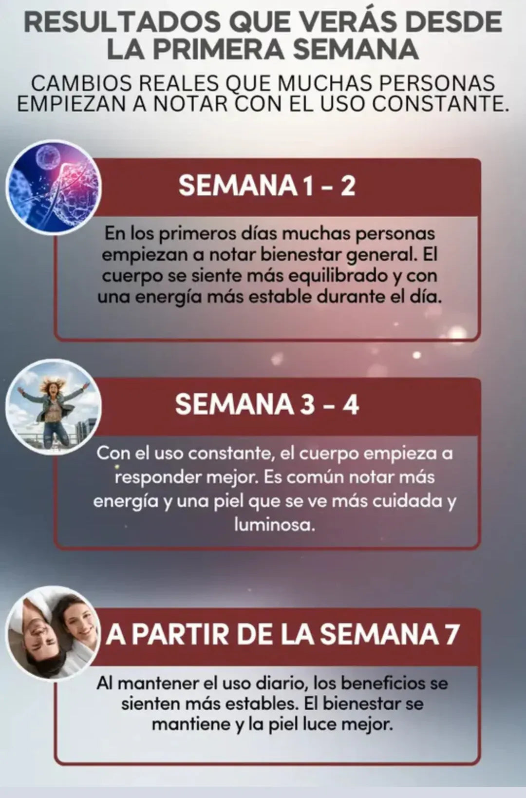 Muchos usuarios reportan menos dolor y recuperación más rápida tras 1–3 semanas, con mejoras claras en rendimiento en 4–8 semanas.