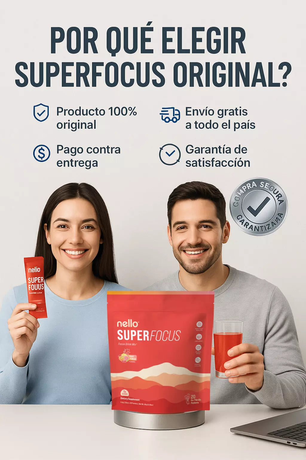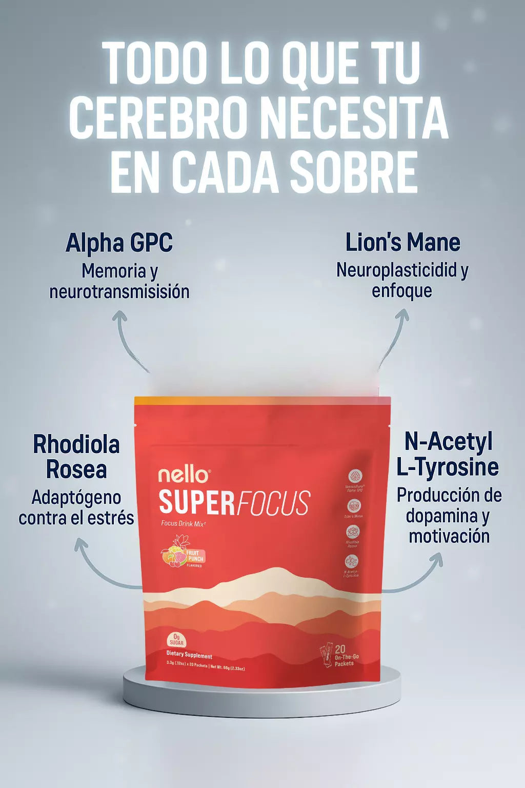Superfocus es una mezcla nootrópica en polvo diseñada para mejorar concentración, memoria y energía sostenida, ideal antes de trabajo intenso, estudio o reuniones importantes.